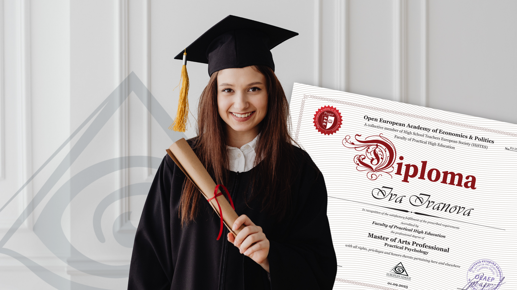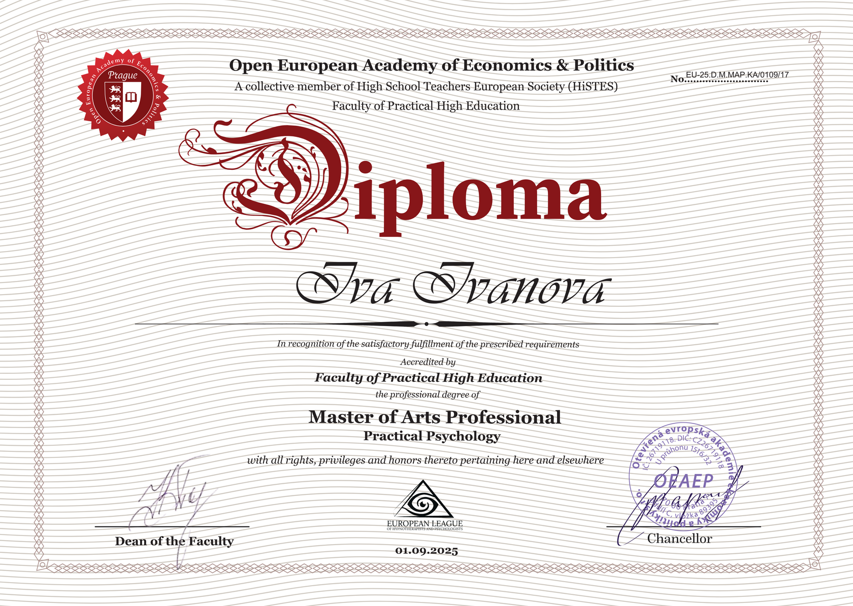 - Диплом магистра-гуманитария (степень МА) ЕЛГиП на базе OEAEP (Чехия) по психологии, официально признанный в странах ЕС и СНГ